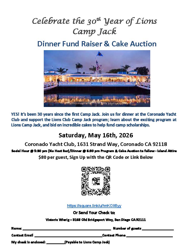 Providing a free camping experience for at-risk youth every year is a costly venture. Lions Camp Jack receives major donations from the Downtown San Diego Lions Club, Lions Clubs of San Diego County, and many other generous sponsors. However, Camp Jack also relies on the assistance of individual community donors like you.